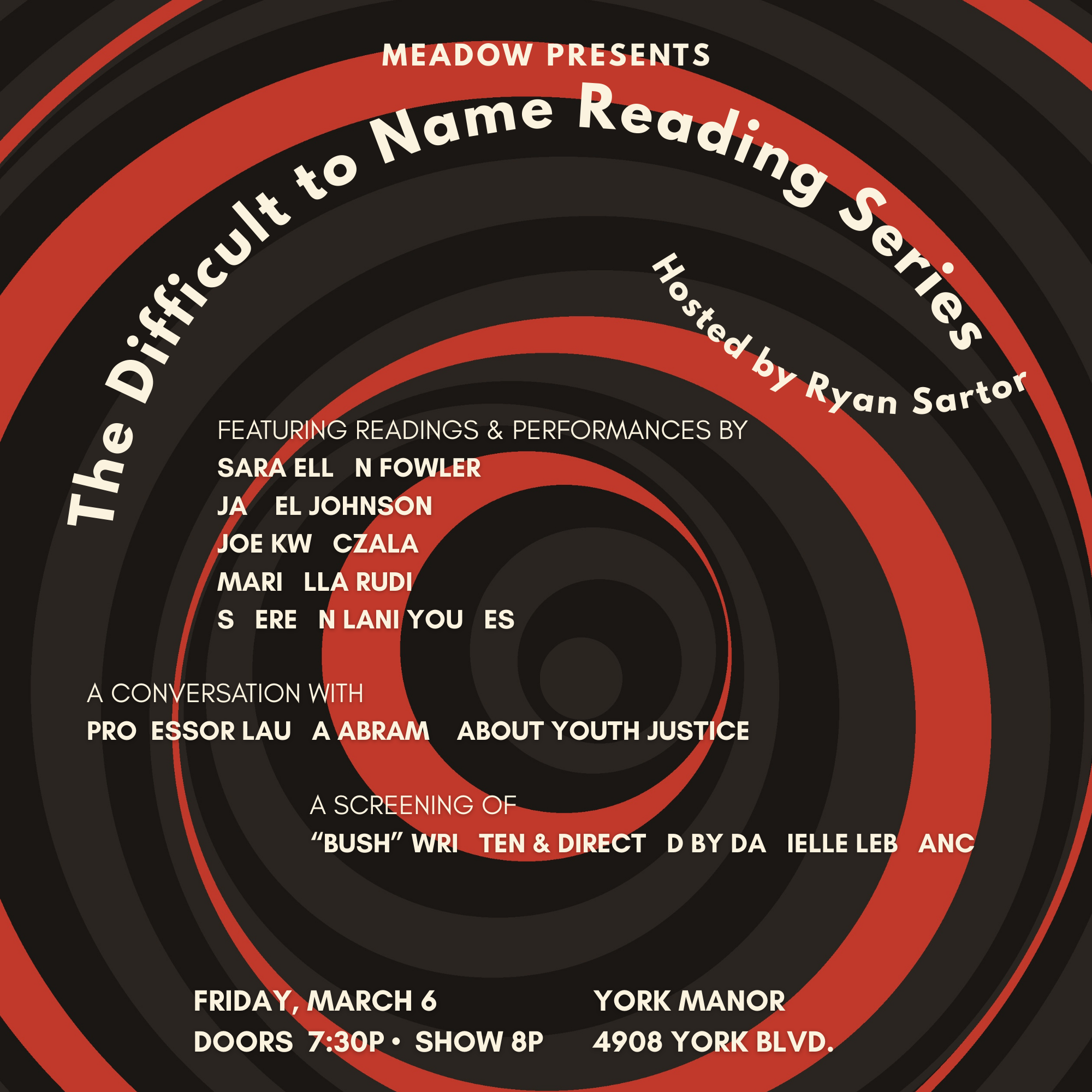 Meadow Presents: the Difficult to Name Reading Series, hosted by Ryan Sartor. Doors at 8, show at 8:30. Free admission & BYOB.