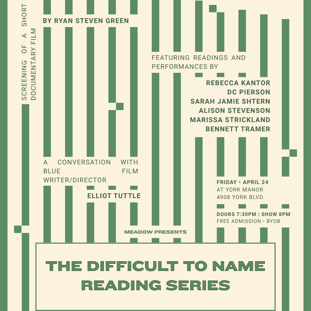 Meadow Presents: The Difficult to Name Reading Series. Featuring readings, performances, short films & great conversations.